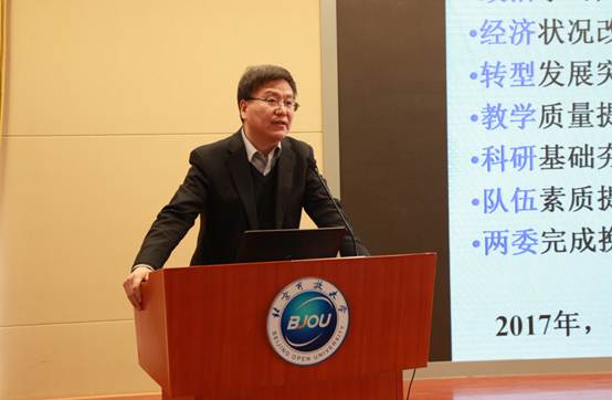 褚宏啟總結了學校2017年工作,部署了2018年重點工作,并做了題為《夯實基礎,追求卓越》的報告。他強調,學校正處在轉型發展、深化改革的歷史時期,落實好市委市政府要求,辦好北京開放大學、建立健全市民終身學習體系,是我們的歷史使命,責任擔當,也是我們面臨的重大歷史性機遇。我們的改革轉型,要堅持科學、民主、法制的原則,堅持質量立校、開放興校、人才強校的戰略,用智力做好頂層設計,用毅力堅持轉型發展,用實力做好現代管理,逐步解決矛盾問題,提升教學、科研、管理質量效益,在教育教學質量、教學內容、教學方法的改革方面加強探索和創新,在信息技術與教育教學的深度融合上下更大的功夫,以良好精神狀態和忘我的工作精神圓滿完成黨的十九大和學校黨員大會提出的各項工作任務。