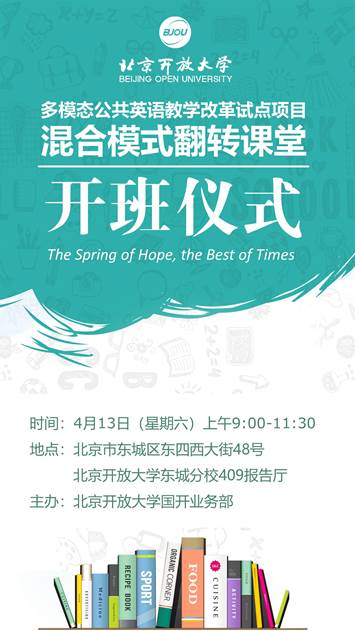 4月13日上午,在東城分校美術館校區409報告廳,北京開放大學多模態公共英語教學改革試點項目混合模式翻轉課堂的開班儀式成功召開。