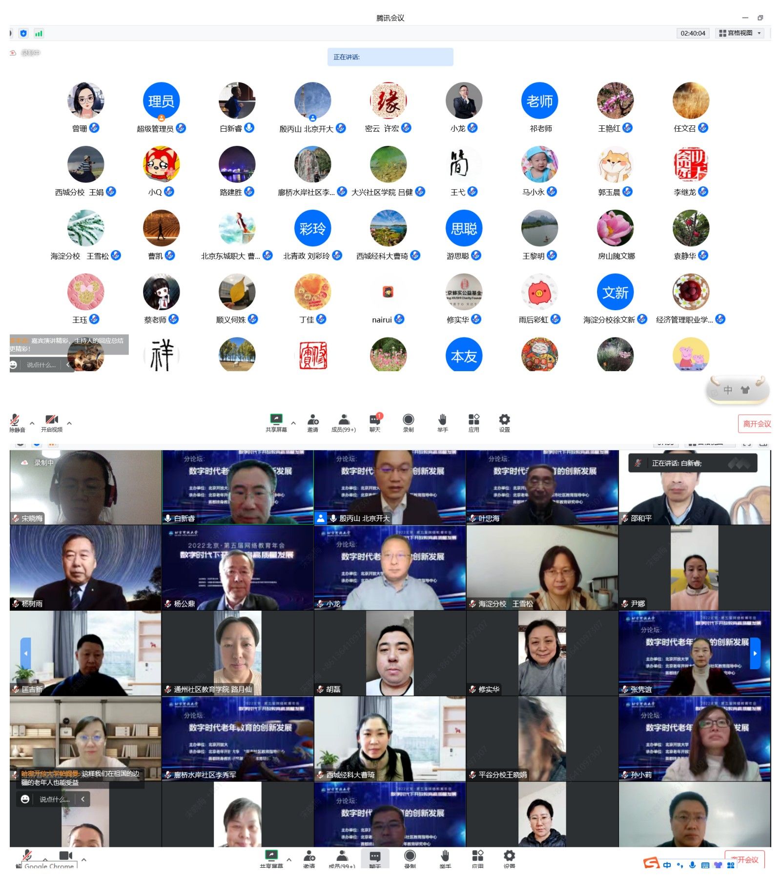 各位與會專家學者代表不同層次的辦學機構,以“數字時代老年教育的創新發展”為主題進行了交流分享,我國老年教育的資深專家葉忠海教授率先以“新時代中國老年教育發展的戰略趨向”為題,對黨的二十大以后老年教育的發展趨勢進行了分析和研判,北京老年科技大學、豐臺區社區學院、通州區宋莊鎮成人技術學校、昌平區廊橋水岸社區分別作為市、區、鄉鎮(街道)、社區(村)四級辦學體系的代表,向與會者匯報了各自開展老年教育的實踐與體會。首開寸草養老服務有限公司作為養老機構的典型代表,把養老機構開展老年教育的實踐做了經驗交流。論壇最后,北京老年開放大學以“老年教育高質量發展的時代背景、服務模式與實踐路徑”為題,把未來老年教育發展需要協作會成員密切配合的八項重點工作作了分享交流。