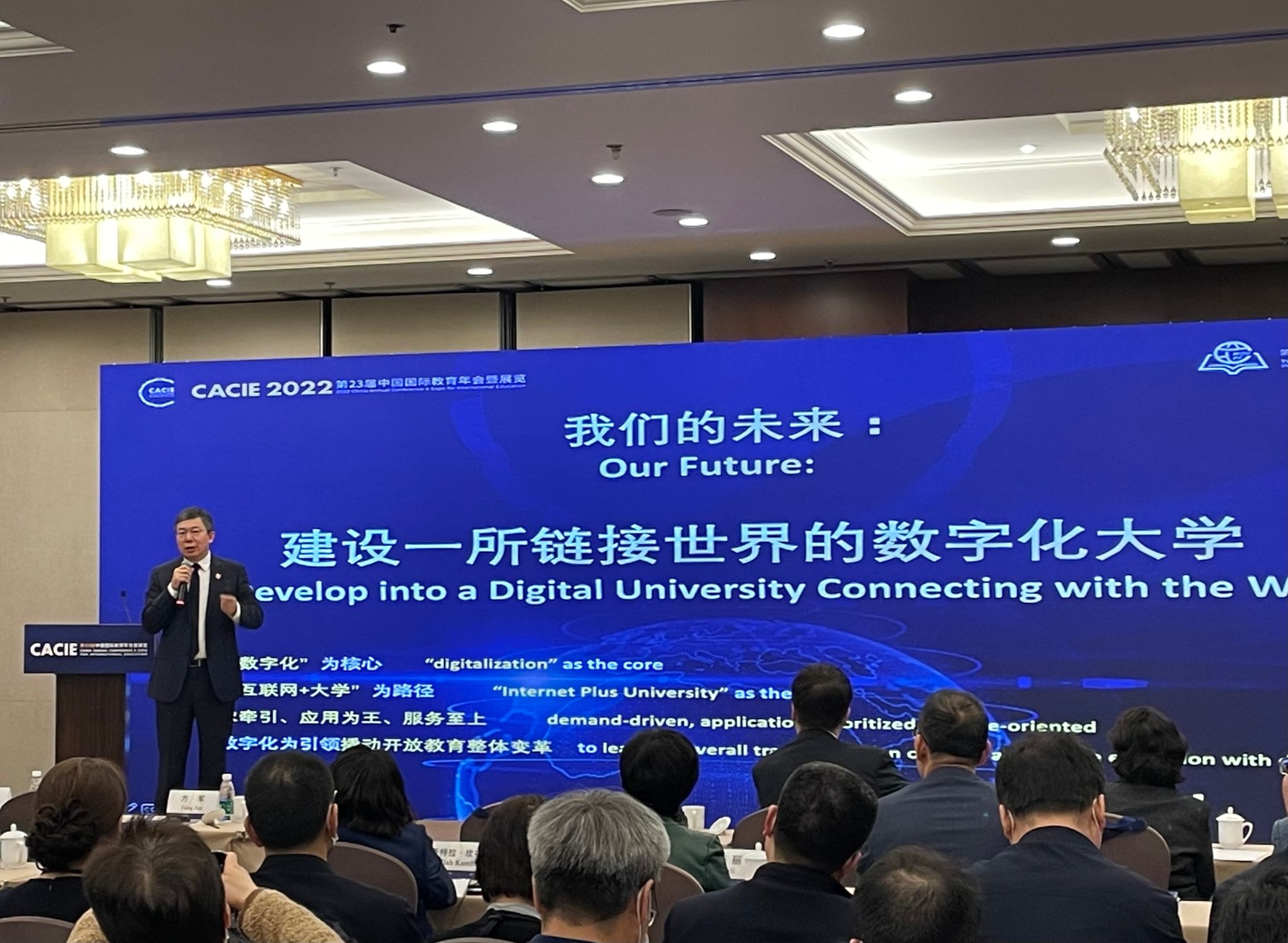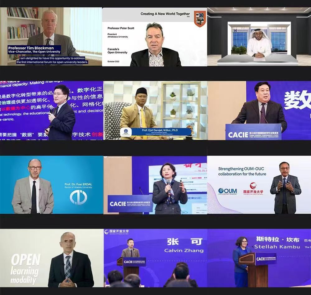 本次論壇作為第23屆中國國際教育年會暨展覽平行論壇之一,由國家開放大學發起并主辦,以“共創未來:應對新挑戰的開放教育數字化行動”為主題。來自全球10多個國家和地區的600多名代表線上線下參會。教育部國際合作與交流司副司長、一級巡視員方軍和聯合國教科文組織駐華代表處主任夏澤翰分別致辭。來自中國、加拿大、英國、阿聯酋、印尼、土耳其、馬來西亞、哥斯達黎加等8個國家的11位開放大學校長作了主旨發言,從教育新型基礎設施建設、數字資源供給與建設標準、學習過程行為分析、各國開放大學所關注的優先領域等不同層面分享了應對新挑戰的開放教育數字化行動探索與實踐。國家開放大學黨委書記、校長荊德剛以《深入推進教育數字化 建設數字化大學》為題作了主旨發言,提出了數字化大學建設的目標、路徑和重點工作,發起了“一帶一路”開放教育發展聯盟倡議。國家開放大學黨委委員、副校長李松發出“世界開放大學發展指標體系”專題研究邀請。
