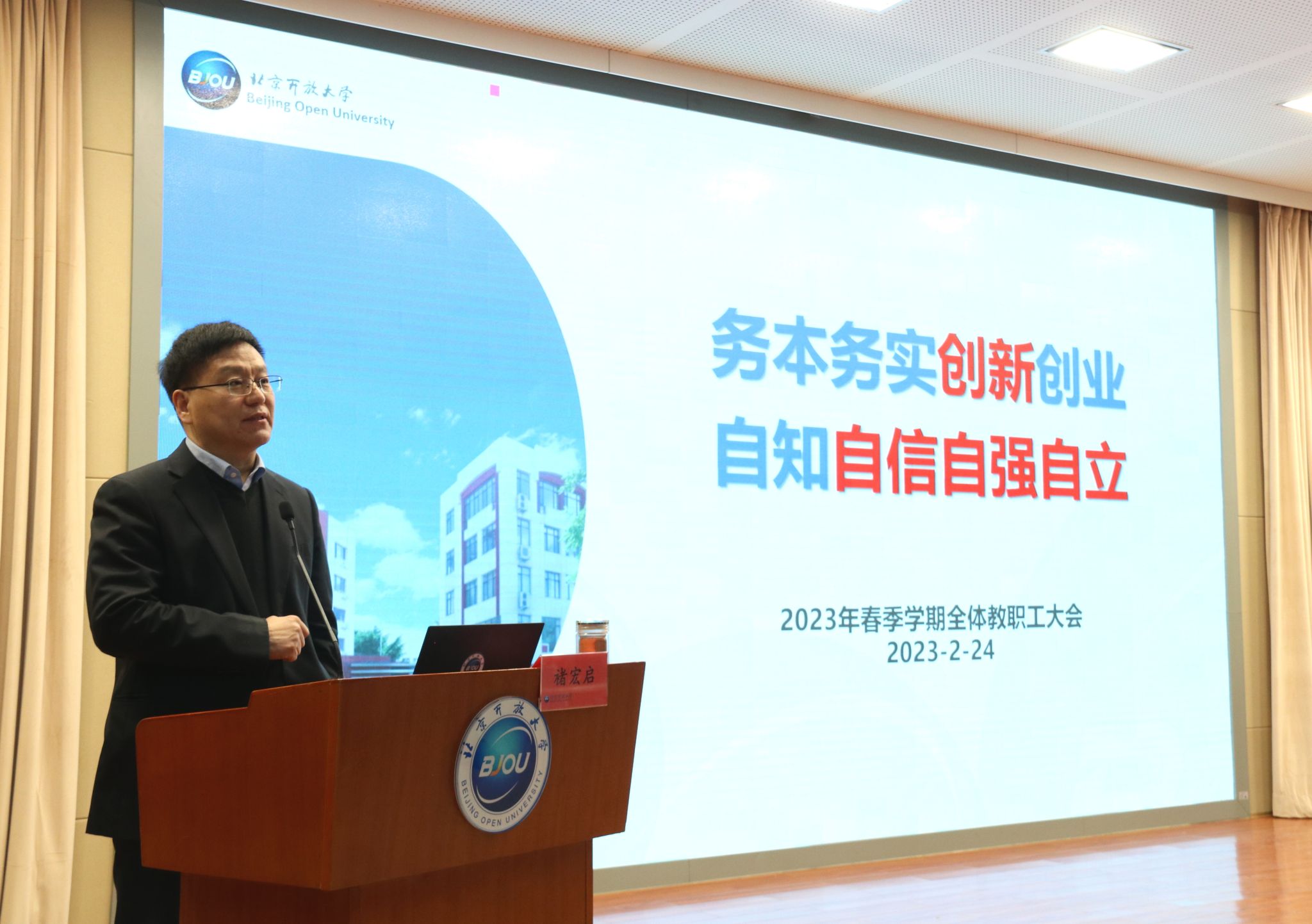 2月24日上午,學校召開2023年春季學期全體教職工大會,部署2023年工作。本次會議主題是堅持以習近平新時代中國特色社會主義思想為指導,深入學習貫徹黨的二十大精神,把握形勢、明確任務,圍繞新時代新征程,創新發展、凝心聚力,推動學校全年各項任務圓滿完成。黨委副書記、校長褚宏啟主持會議并以“務本務實創新創業,自知自信自強自立”為主題做了講話。