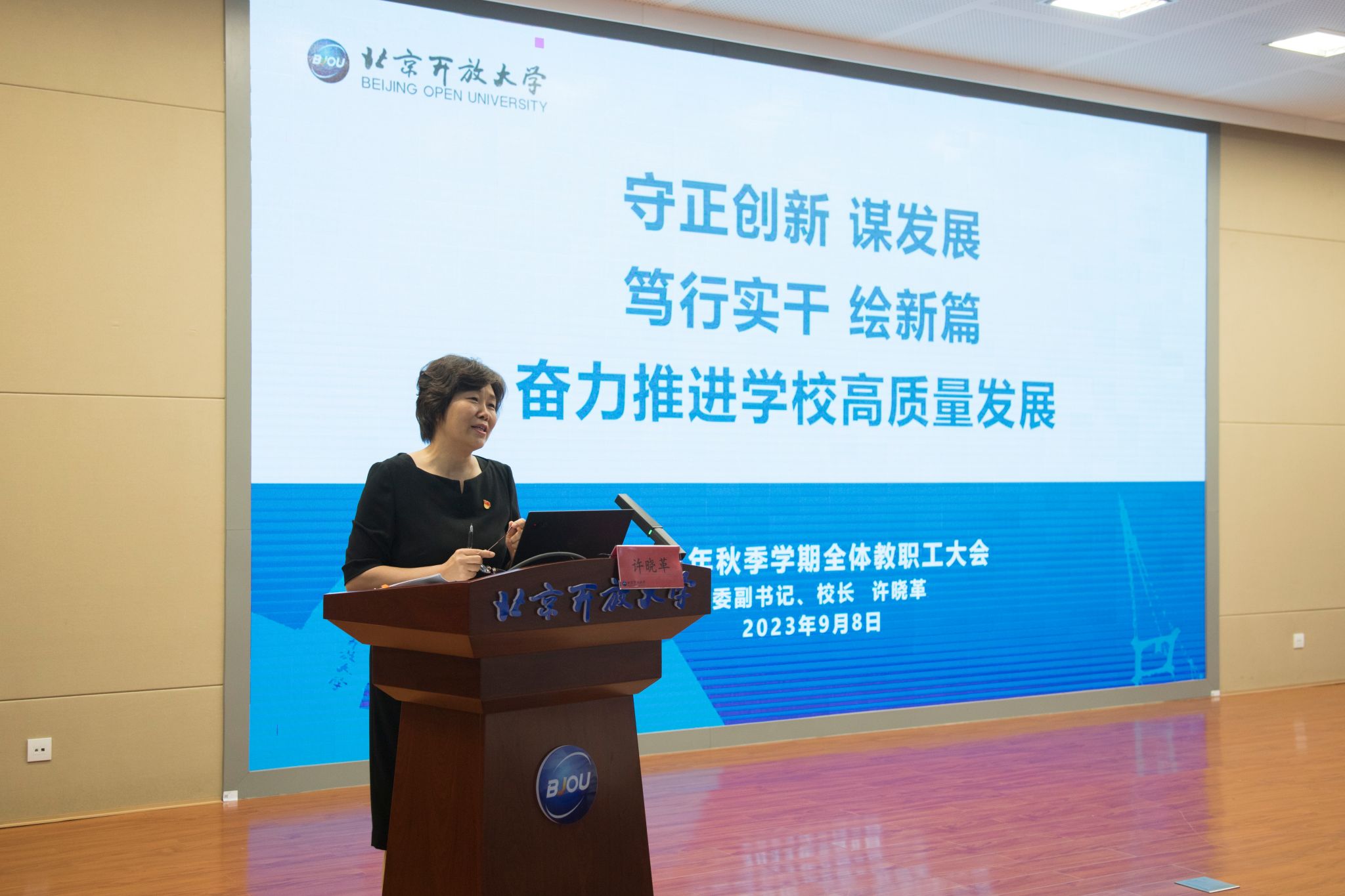 許曉革強調,下半年學??傮w工作思路是堅持以習近平新時代中國特色社會主義思想為指導,全面學習宣傳貫徹黨的二十大精神,以兩委換屆、國開辦學評估、機構調整和新一輪全員聘任為契機,堅持創新驅動高質量發展,推進教育數字化轉型,深化教育教學綜合改革,不斷提高服務全民終身學習和首都學習型城市建設能力,辦好人民滿意的開放教育。學校將進一步加強黨的全面領導,推動黨建工作和治理水平穩步提升;深化教育教學綜合改革,持續推動學歷教育創優提質;聚焦特色品牌建設,推動非學歷教育提量增效;加快推進學分銀行與信息化建設,推動數字化轉型升級;著眼專業能力建設,強化人才支撐和智力保障;推進學校治理變革,不斷提升現代大學治理能力和水平。各項任務艱巨、工作繁重、進度緊迫,希望全體教職工主動按下“快進鍵”、跑出“加速度”,奮力開啟“新征程”。