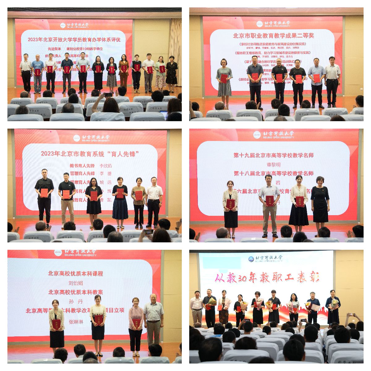 會上,為教齡滿30年教職工頒發了證書,并對學歷教育辦學體系評優、北京市職業教育教學成果獎、北京高校優質本科課程、北京高校優質本科教案、北京高等教育本科教學改革創新項目立項、北京市教育系統育人先鋒、北京市高等學校教學名師、青年教學名師等獲得教師進行了表彰。