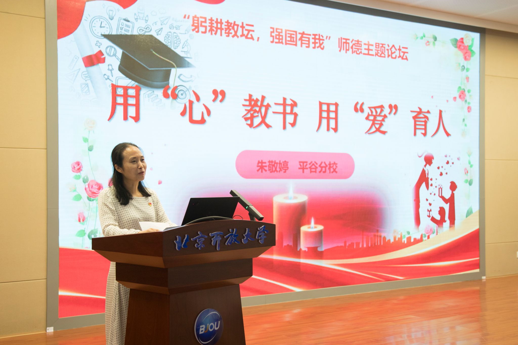 平谷分校教師朱敬婷以“用‘心’教書,用‘愛’育人”為題,講述了自己對教師“立德樹人”的理解,強調教師既要堅定教育信仰,為人師表,率先垂范,又要做學生的良師益友,始終懷有仁愛之心,有愛才有真教育。