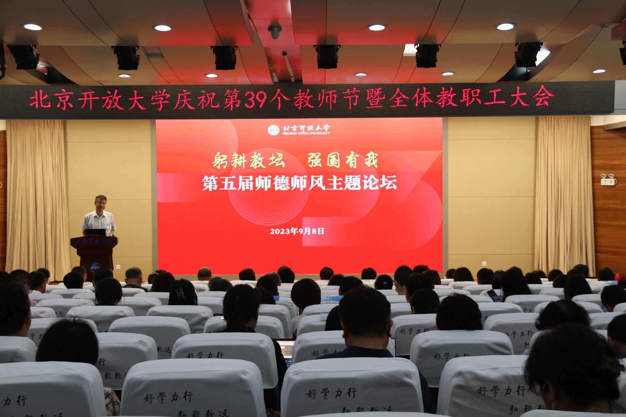 為深入學習貫徹習近平新時代中國特色社會主義思想、習近平總書記關于教育的重要論述,全面落實師德教育集中學習要求,發揮優秀教師示范引領作用,促進開放教育高質量發展,9月8日,在第39個教師節即將來臨之際,學校舉辦了“躬耕教壇,強國有我”第五屆師德師風主題論壇暨教師節表彰大會。全體校領導、全體教職工參加了會議。會議由副校長王想年主持。