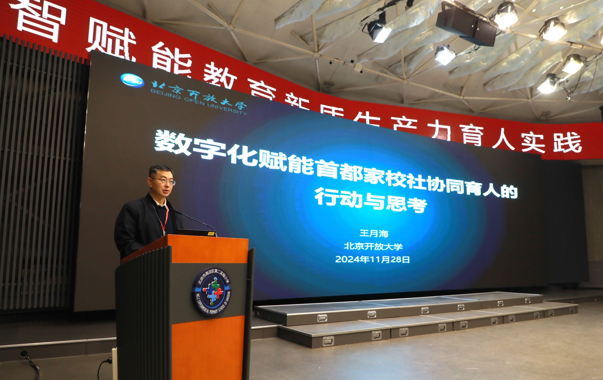 在活動中,北京開放大學副校長王月海發表了主題為 “數字化賦能首都家校社協同育人的行動與思考”的主旨報告。他在報告中深入解讀了數字化賦能首都家校社協同育人的行動與思考。詳細介紹了北京市在數字化賦能家校社協同育人方面的實踐探索,包括全方位數字化宣傳、設立網上家長學校、搭建“京學網”及“同育橋”微信小程序等資源共享平臺、優化校園數字生態以及AI精準化診斷需求等。
