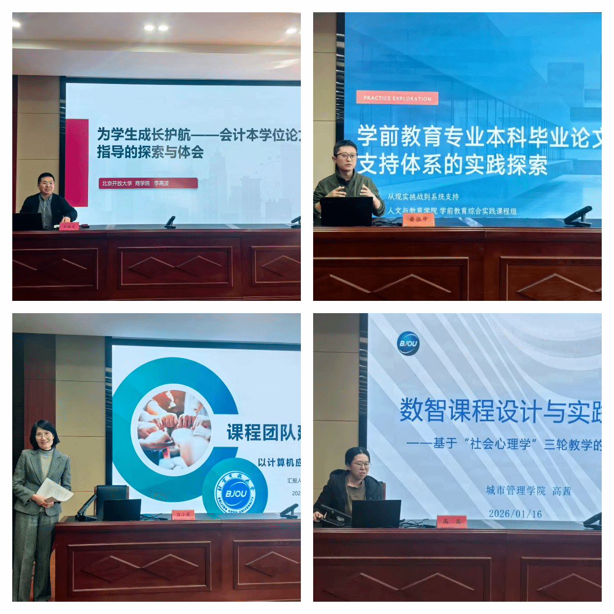 會上,四位來自不同學院的教師代表先后作交流分享。李高波老師圍繞會計學本科學位論文指導,系統闡述了指導工作的價值理念、具體實踐路徑及實施成效。黃振中老師聚焦學前教育本科專業畢業論文指導的實踐,介紹了集中指導與個性化輔導相結合的模式及資源整合路徑。呂小星老師以計算機應用基礎課程團隊為例,分享了團隊從組建、運行到聚焦AI賦能教學與課程思政融合的建設經驗與實踐成效。高茜結合“社會心理學”教學實踐,系統匯報了基于數智平臺的三輪教學改革歷程,涵蓋課程設計、策略迭代與教學成效優化等方面。