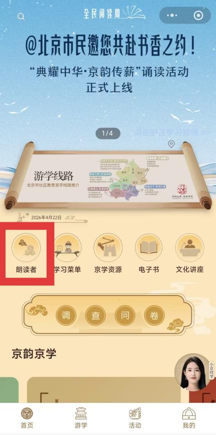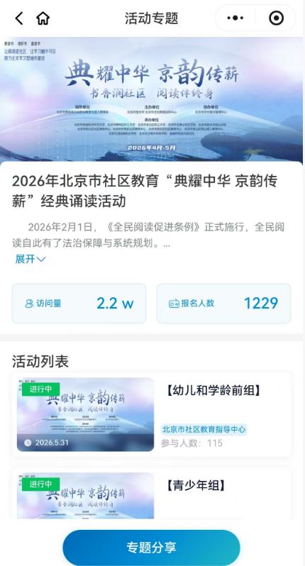 作為本次活動的線上主陣地,我校微信小程序“京學坊”迅速成為市民云端誦讀的“熱門打卡地”。自4月20日全民閱讀周正式啟動以來,截至4月22日,“朗讀者”專題累計訪問量已突破2.2萬人次,報名人數達1000多人,覆蓋幼兒、青少年、成人、銀齡及親子五大組別。誦讀篇目涵蓋經典詩詞、散文名篇與傳統蒙學,傳承中華文脈,厚植家國情懷。以朗讀促城教融合,以文化助社區治理。篇目短小精悍,語言優美,兼具思想性與感染力,在聲聲誦讀中涵養文化自信,凝聚精神力量。
