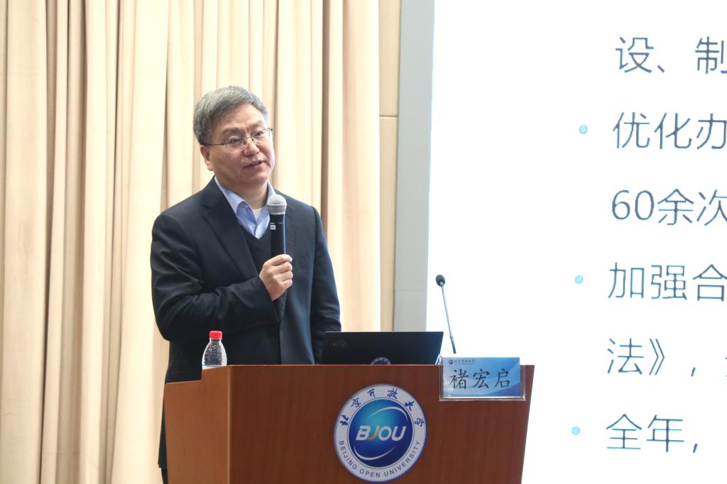 褚宏啟部署下一步工作時指出,學校要全面貫徹落實黨的十九屆五中全會精神,把握新發展階段,貫徹新發展理念,構建新發展格局,推動高質量發展。要緊緊圍繞首都“四個中心”功能定位,在構建全民終身教育體系和服務學習型城市建設中,發揮不可替代的作用。2021年,學校要以高質量發展為主線,以深化改革為動力,繼續堅持“規模、規范、有序、有效”工作總要求,全面實施“1322”工程,加快推進開放教育現代化。一要推進學歷與非學歷教育優質化發展;二要推進招生與辦學體系規?;l展;三要推進教學、管理的信息化水平和學分銀行建設;四要加強校本研究,實現理性化發展;五要擴大國際合作與交流,推進國際化發展;六要推進教師隊伍和干部隊伍專業化發展;七要加強黨建,推進內部治理制度化建設。