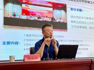 國開業務部主任張驚濤和事業發展部主任李海英分別就國家開放大學招生工作會議精神和自主業務招生重點工作進行了傳達部署。