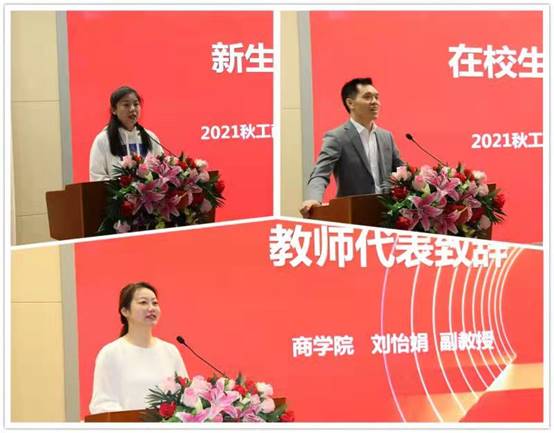 教師代表、商學院副教授劉怡娟老師代表全體教師向同學們承諾:將恪盡職守,以自己全部的知識和熱情,助推每一位同學的成長;用高標準的師德規范、教師行為規范要求自己,全力以赴為同學們提供優質的學習支持服務。她還分享了學習心態與學習方法,倡導同學們培養終身學習的習慣,成為更好的自己。