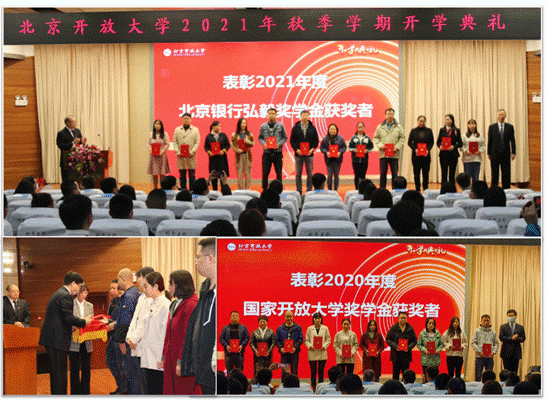 典禮在莊嚴的奏唱國歌中開始。副校長李繼延宣讀獲得國家開放大學獎學金和北京開放大學弘毅獎學金的表彰決定,楊公鼎書記、褚宏啟校長分別為獲獎代表頒發證書。