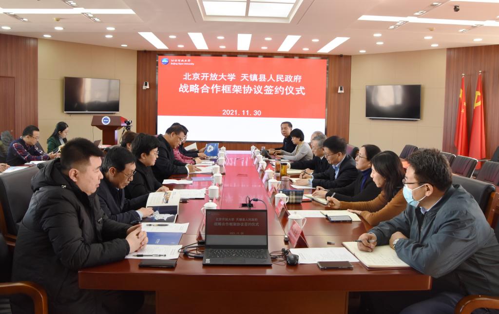 簽約儀式上,褚宏啟校長、賀薈錦副縣長分別代表北京開放大學和天鎮縣人民政府簽署戰略合作協議。根據協議,天鎮縣發揮“天鎮保姆”品牌優勢,北京開放大學發揮教學資源優勢,雙方共同推出針對家政培訓師資、管理者的“千人培養計劃”等合作項目。