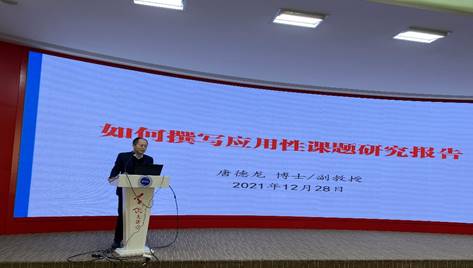 唐德龍副教授做了主題為“如何撰寫應用型課題研究報告”的學術講座。他結合自身科研經歷,從什么是應用性課題研究、如何撰寫應用性課題研究報告以及如何完善應用性課題研究報告等方面做了詳細的講解。唐教授的報告內容豐富,案例詳實,操作性強,給老師們諸多啟發。在交流討論環節,唐教授就學院教師關心的應用性課題申報、研究報告成果化等問題提出了建設性指導意見。