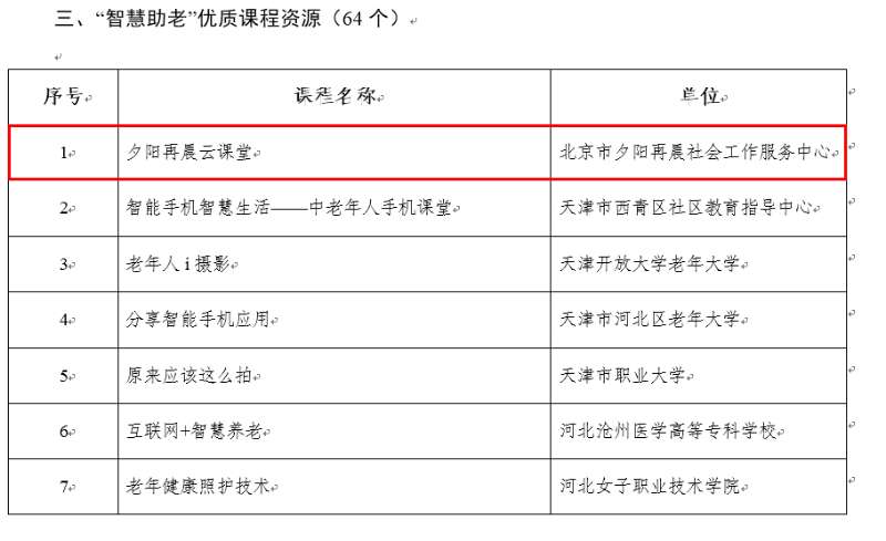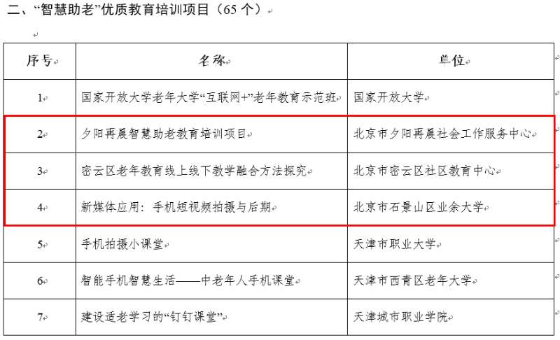根據《教育部辦公廳關于廣泛開展老年人運用智能技術教育培訓的通知》要求,在全國各省級教育行政部門推薦的基礎上,經專家綜合評議,全國共評選出38個優質工作案例、65個教育培訓項目及64門課程資源。北京老年開放大學積極發揮市級老年教育統籌指導職能,協助市教委承擔了北京市“智慧助老”優質工作案例、教育培訓項目及課程資源項目推介工作。其中,由我校報送的《北京老年開放大學“百千萬智慧助老”公益行動》《莫道桑榆晚,其霞尚滿天——夕陽再晨智慧助老之路》入選首批“智慧助老”優質工作案例;北京市密云區社區教育中心、北京市石景山區業余大學、夕陽再晨等單位的智慧助老教育培訓項目入選優質教育培訓項目,夕陽再晨云課堂入選“智慧助老”優質課程資源。