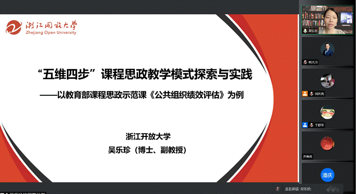 吳樂珍博士以“‘五維四步’課程思政教學模式探索與實踐”為主題,結合教育部課程思政示范課《公共組織績效評估》建設情況,講解了課程思政的著力點、高效課堂的特征、高效課堂的八大評判標準和“五維四步”課程思政教學模式,并結合知識點“公共部門績效評估指標與標準”重點展示了如何運用“五維四步”教學模式深入挖掘思政元素,在教學過程中如何運用“啟”、“承”、“轉”、“合”等方法保持有節奏的教學過程,最終實現知識整合、思維重構、情感升華的課程思政目標,有效提升學生的綜合學習體驗。