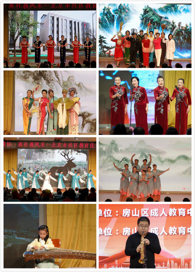 經過各區初選和全市遴選,共有21個節目參加了展演,表演形式包括歌曲、舞蹈、模特、樂器、話劇、朗誦、音樂劇等,涵蓋了老、中、青、少各年齡段,年齡最大的85歲,最小的8歲。西城社區學院選送的《國粹》節目,演員以端莊的氣質、多彩的服飾及豐富的肢體語言演繹了“國粹”精華。北京春藤社會工作促進中心選送的《迎國慶體育人展風采》節目,參與人員包括排籃足手球名將、田徑體操名宿、亞洲標槍記錄第一人和擊劍銀牌國家隊領隊,雖是滿頭白發,風采不減當年,充分展現了社區老年教育教學成果。密云區社區教育中心選送的《五彩課堂》節目,再現了社區教育中書法繪畫、太極瑜伽、鋼琴聲樂、舞蹈模特、攝影電腦、數獨英語等真實場景。東城區職工大學選送的《你的房本我的房》節目,把課堂搬到了展演舞臺,以短劇小品形式開展普法宣傳。房山區成人教育中心選送的巴烏合奏《趕擺歸來時》,用巴烏吹奏心中的情歌,歌頌美好幸福生活的歡樂場景。其他各區選送的節目也內容豐富、賞心悅目、精彩紛呈,充分展現了社區教育優秀成果。