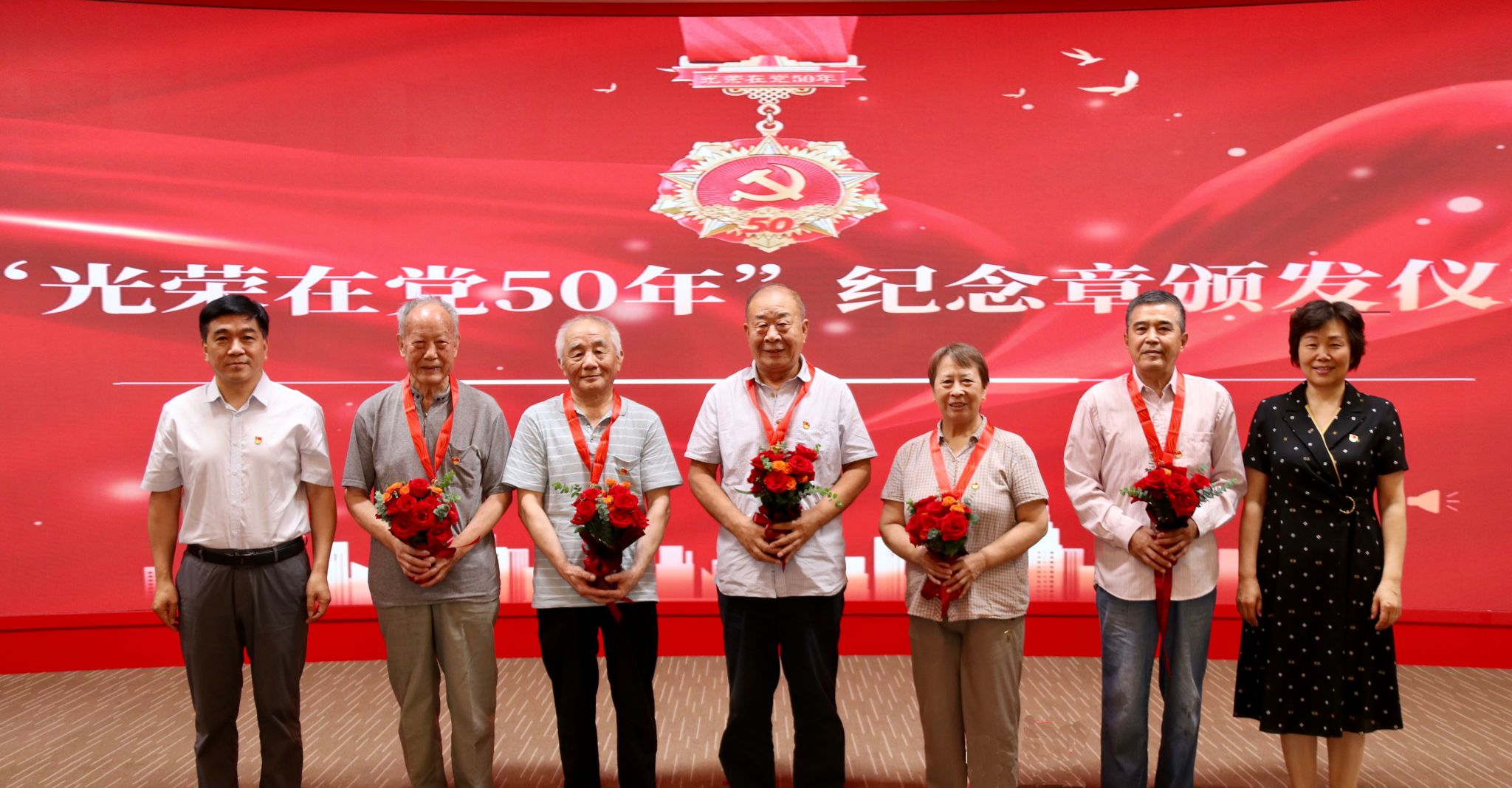 會上,許曉革、周啟柏為“光榮在黨50年”老黨員趙國森、張文大、崔志旺、王玲芝、潘乃新頒發紀念章并獻花。