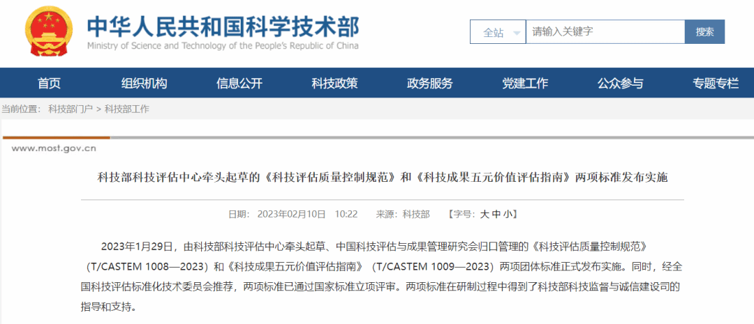 2023年1月29日,由科技部科技評估中心牽頭起草、中國科技評估與成果管理研究會歸口管理的《科技評估質量控制規范》(T/CASTEM 1008—2023)和《科技成果五元價值評估指南》(T/CASTEM 1009—2023)兩項團體標準正式發布實施。同時,經全國科技評估標準化技術委員會推薦,兩項標準已通過國家標準立項評審。兩項標準在研制過程中得到了科技部科技監督與誠信建設司的指導和支持。