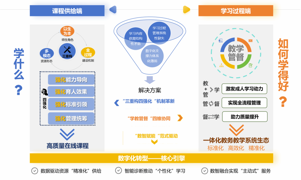 2021年起,系統制定在線課程建設標準、課程思政實施方案及校級“雙一流”建設意見,依托多層面調研形成教學教務一體化智慧平臺建設方案。以“學校-學院-學習中心”開放辦學體系為載體,全面推進教育教學數字化轉型。通過“三重構、四強化”革新課程供給,建成高質量在線課程體系;以“學-教-服-督”四維協同實現教學全流程標準化、高效化與精準化,顯著提升學生學習效能。