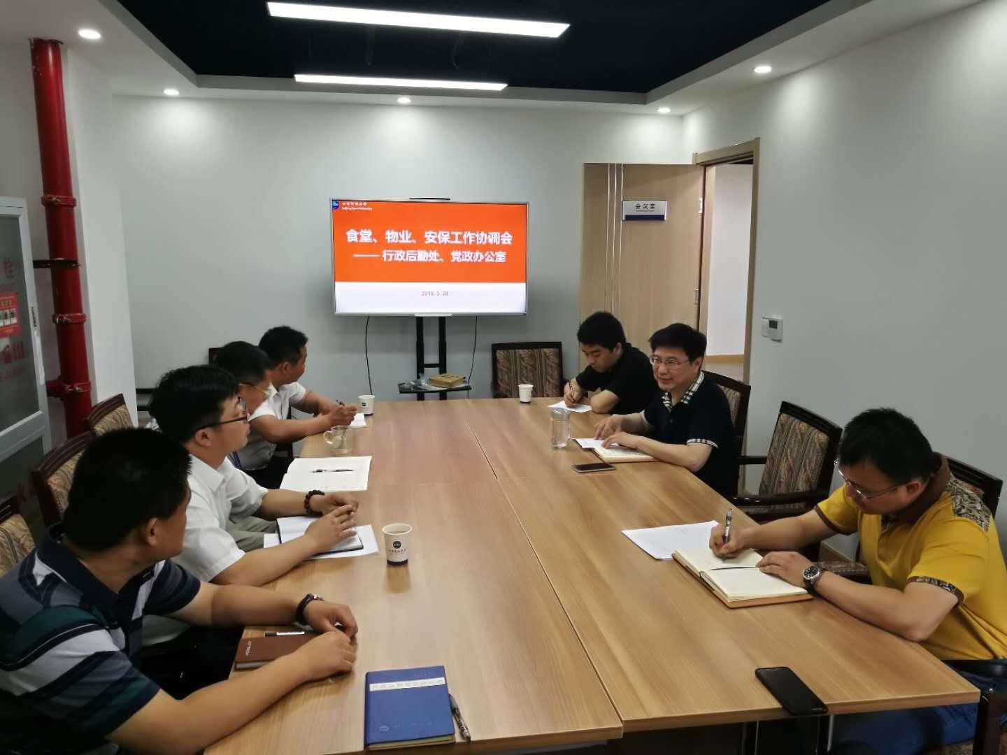 2018年5月28日上午10:30,在南校區食堂樓4層會議室,行政后勤處召開了食堂、物業、安保工作協調會。行政后勤處和黨政辦公室人員參加了會議。會議由王鳳祿處長主持。因學校南校區鍋爐改造施工及北... -
